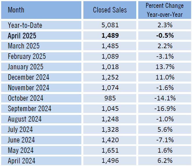 Pending sales dropped by about 3% year-over-year, totaling approximately 1,530 for April. While this is a small decline, it’s a forward-looking metric that suggests we may see a modest increase in closed sales in May once those pending deals finalize.